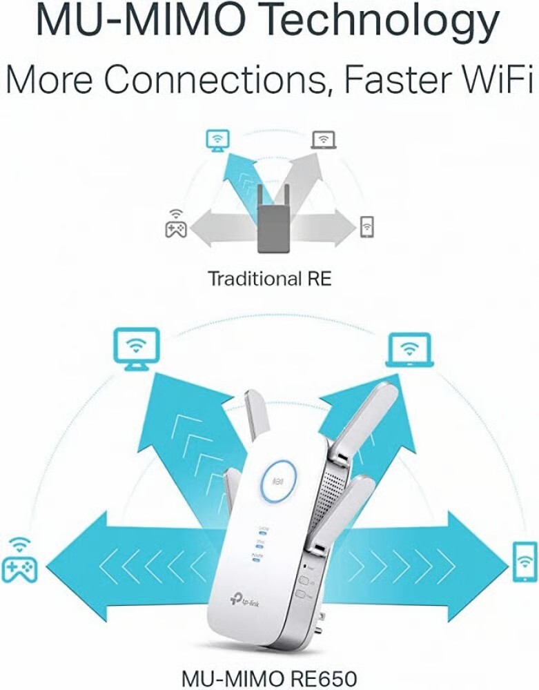 MU-MIMO Wave 2 technology allows the RE650 to talk to multiple devices simultaneously for optimal cross-device performance. Beamforming technology sends the targeted WiFi signal to individual devices for stronger connections