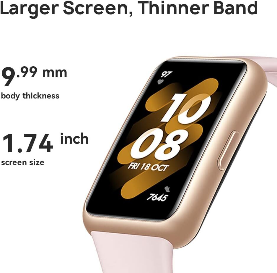 يتميز السوار بشاشة AMOLED مذهلة تبدو وكأنها تطفو في الهواء بفضل التصميم الخفيف للغاية، حيث تجلس فوق حزام عالي التهوية يلتف حول المعصم بمنتهى السهولة. تُبرز الحواف الضيقة للغاية المحتوى بشكل رائع على الشاشة لجذب الانتباه إلى الخدمات والميزات التي تحبها.
