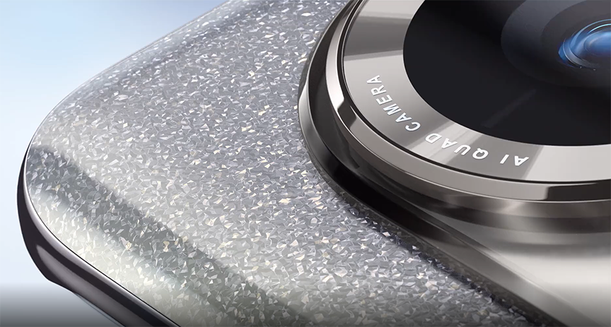 يتميز التصميم الجديد كلياً بتقنيات دقيقة وجديرة بالاهتمام، وتتمثل في تقنية الطلاء المزدوج، ثنائي التركيبة والتي تجعل الهاتف يتلألأ مثل الألماس.